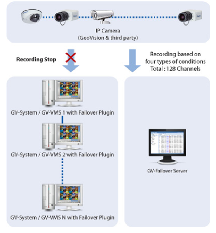 Phần mềm Failover Server được cài đặt trên máy chủ đặt tại trung tâm chính. Máy chủ này được kết nối mạng LAN với toàn bộ các IP camera và máy tính ghi hình tại các trụ sở. Phần mềm Failover server cho phép kết nối ghi hình với đồng thời 128 IP camera. Khi khởi tạo hệ thống máy chủ Failover Server sẽ thiết lập kết nối với tất cả các máy tính ghi hình tại các trụ sở. Trạng thái ghi hình của các máy tính này luôn được máy chủ Failover Server theo dõi. Nếu một máy tính ghi hình của trụ sở nào đó bị lỗi thì chỉ mất vài giây là toàn bộ các IP camera của trụ sở đó sẽ được chuyển hướng ghi hình về máy chủ Failover Server. Các chức năng chính của phần mềm như sau: