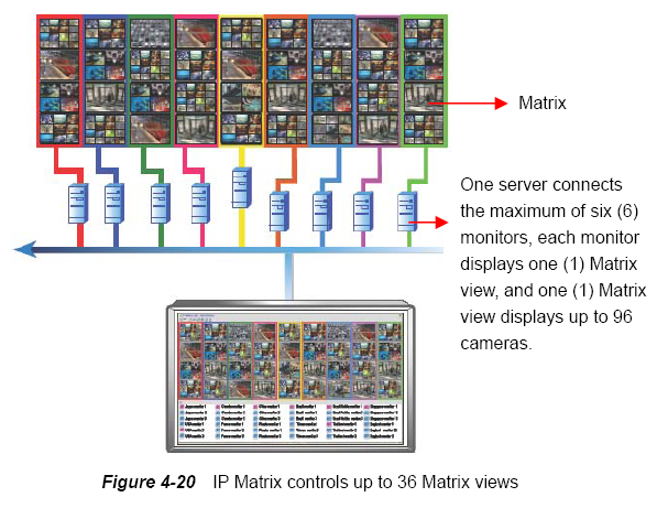 Máy chủ cài đặt phần mềm Control Center nếu lắp 03 VGA Card cho phép nối ra được 06 màn hình máy tính. Mỗi màn hình máy tính hiển thị 01 Matrix View, như vậy với một máy chủ Control Center có thể tối đa giám sát 96 x 6 = 576 camera. Nếu bổ sung thêm 09 máy chủ nữa thì thông qua tính năng IP Matrix, ta có thể thiết lập 36 Matrix View nữa như hình vẽ dưới. Tổng số camera có thể giám sát đồng thời tại trung tâm là 4032 camera bao gồm cả 576 camera trên máy chủ Control Center.