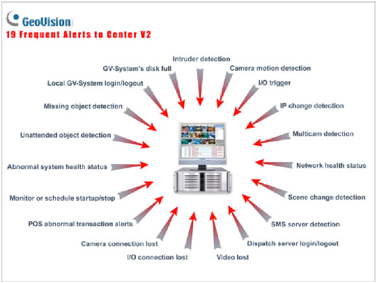 Trạng thái hoạt động của 500 máy chủ camera và toàn bộ IP camera nối với phần mềm CenterV2Pro đều được kiểm soát online thông qua 19 thông cảnh báo dạng text và thông qua các file Video được gửi đính kèm theo các sự kiện. Người quản trị có thể dùng mầu sắc để phân loại cảnh báo và thể hiện mức độ nghiêm trọng của cảnh báo. Khi kích đúp biểu tượng file video được gửi kèm theo cảnh báo người quản trị có thể xem lại đoạn phim trên.