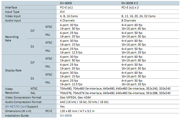 GV-600B GV‐600B Card provides up to 16 video channels and 4 audio channels, recording up to 30 / 25 fps (NTSC / PAL) in total with H.264 software compression
