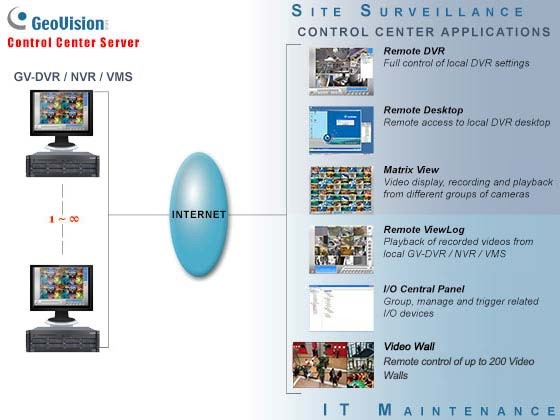 The GV‐Control Center is integrated security management software that provides a handy tool to maintain central monitoring station. GV‐Control Center is a comprehensive solution for central operators to efficiently control GV‐System (GV‐DVR/NVR), GV‐VMS, GV‐Recording Server and I/O devices. With GV‐Control Center, multiple GeoVision surveillance and video management systems can be managed and maintained efficiently to enhance their monitoring performance and ensure smooth operation